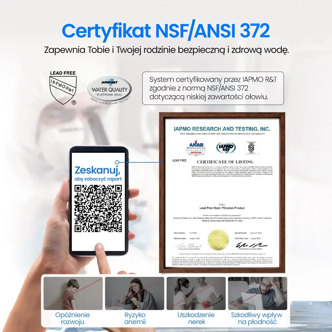 System odwróconej osmozy Waterdrop A2 posiada certyfikat NSF/ANSI 372, potwierdzający niską zawartość ołowiu oraz bezpieczeństwo wszystkich komponentów mających kontakt z wodą pitną.