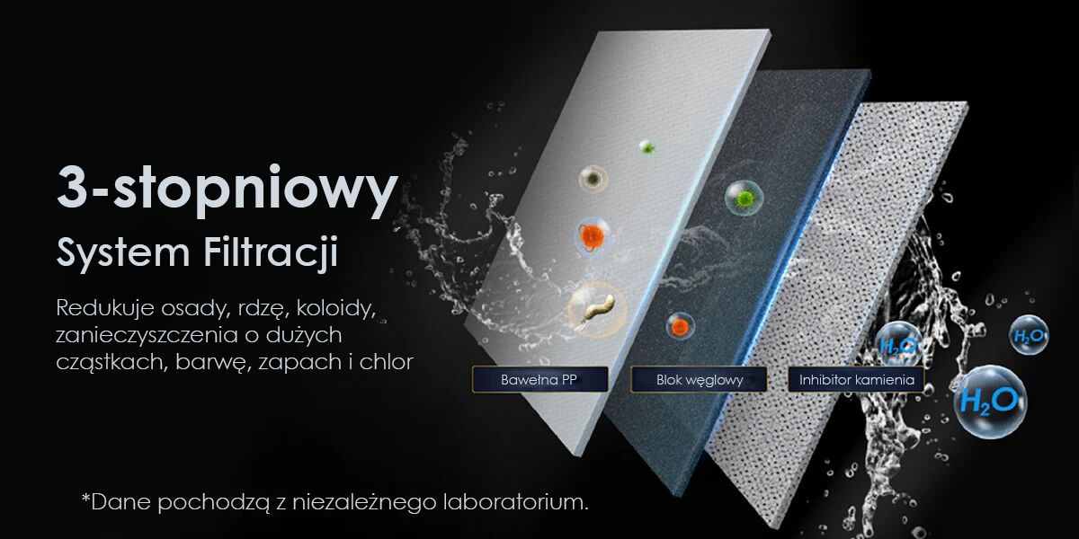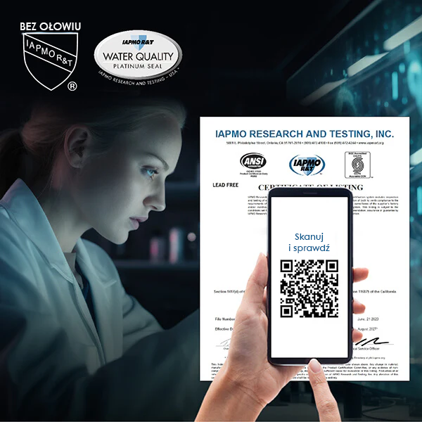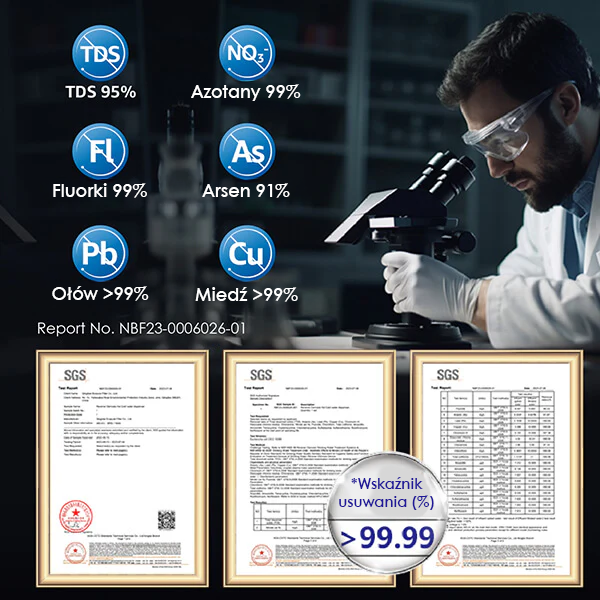 Przetestowany zgodnie z normami NSF/ANSI 42, 53 i 58. Redukuje 99,99% całkowitej liczby bakterii z grupy coli.