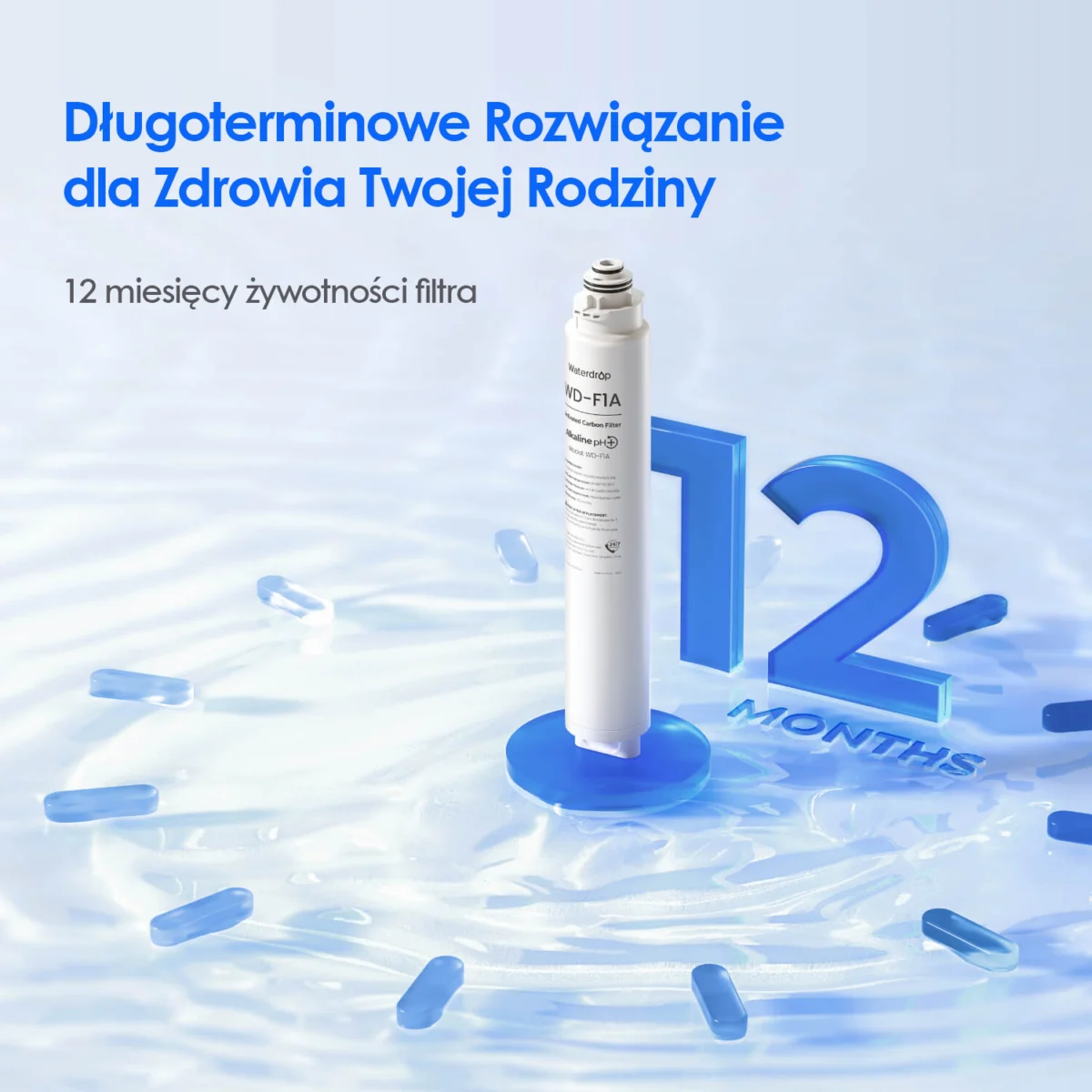 Zapewnia do 12 miesięcy użytkowania dla Ciebie i Twojej rodziny, w zależności od jakości wody.