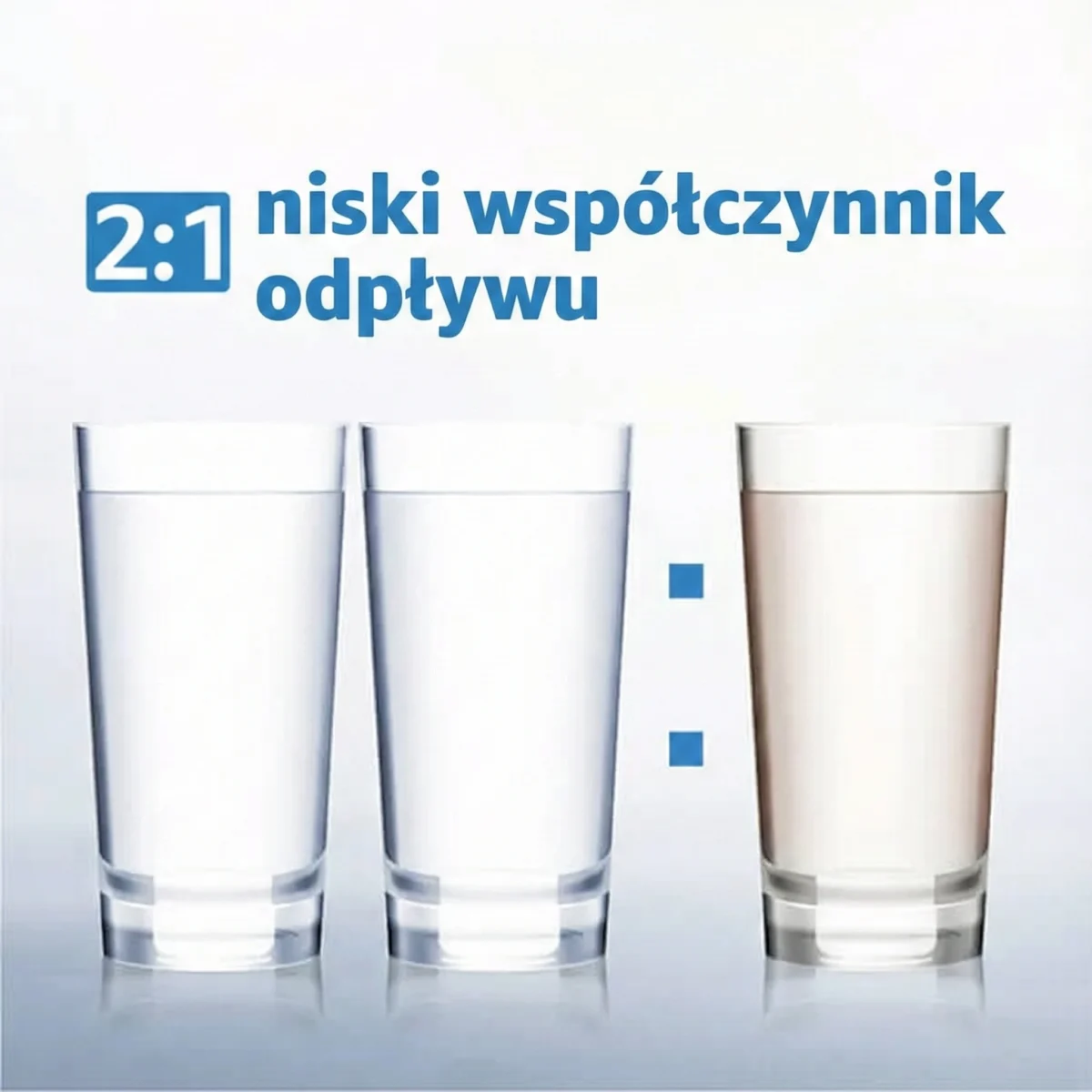 - Przy pobraniu 2 szklanek czystej wody powstaje tylko 1 szklanka wody zużytej.