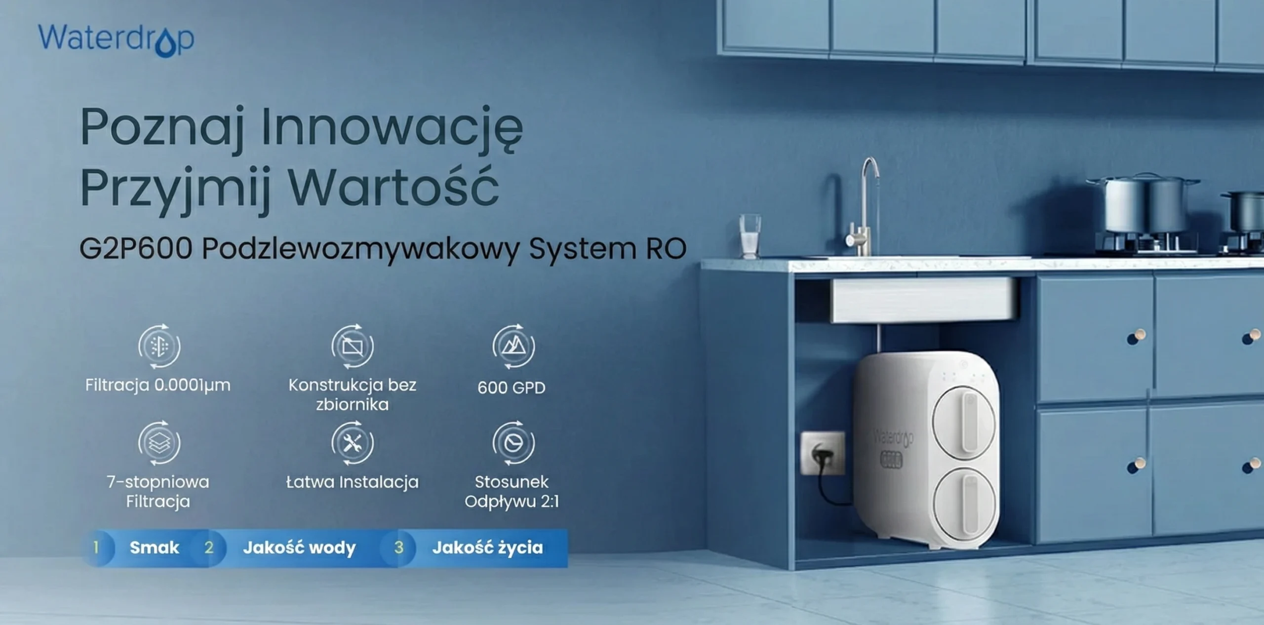 Zaawansowany filtr wody Waterdrop G2P600. Przeznaczony do umieszczenia pod zlewem. Przyjazny, praktyczny, wydajny.