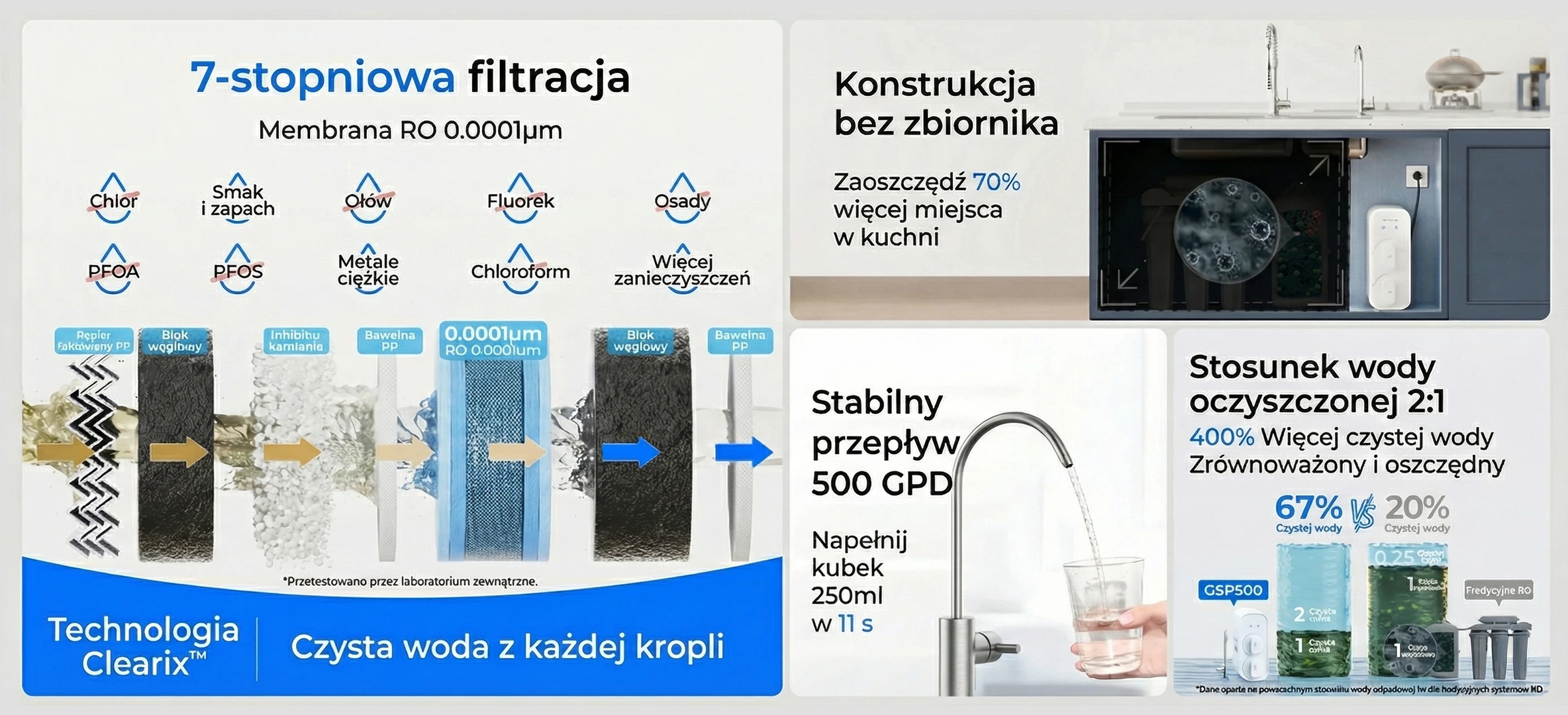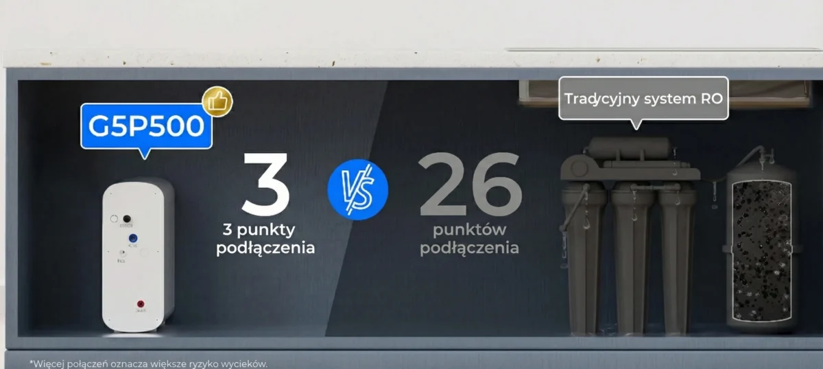 | Żywotność filtra | G5P500-CF – 6 miesięcy, G5P500-RO – 24 miesiące |