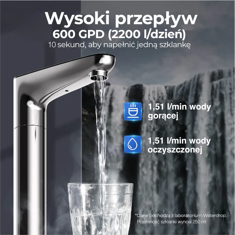 Filtr wody Waterdrop K6 napełnia szklankę o wielkości 250 ml w około 10s.