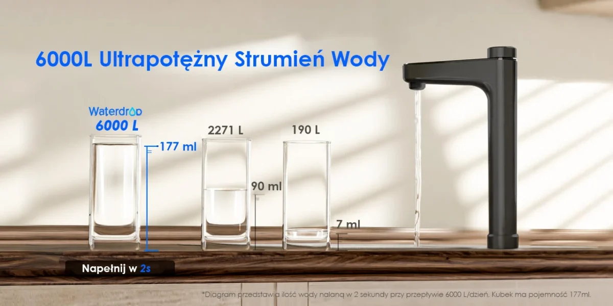 Waterdrop X8 zapewnia natychmiastową czystą wodę dzięki wydajności 800 GPD – bez czekania i przerw.