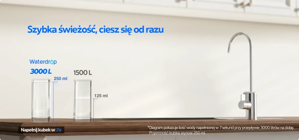 Filtr wody Waterdrop X8 napełnia szklankę o wielkości 250 ml w około 7s.